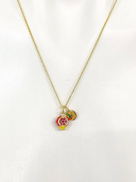 This is a gold -tone Pomegranate Fruit charm with hand stamped initial charm on brass/stainless steel 18 inches chain.