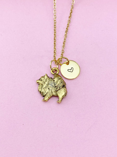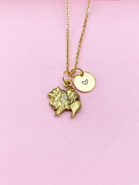 This is a gold tone Pomeranian charm with hand stamped initial charm on brass or stainless-steel chain.
