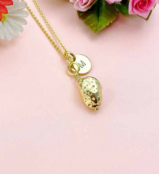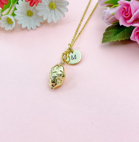 This is gold tone potato charm with hand stamped initial charm on brass or stainless steel 18 inches chain.