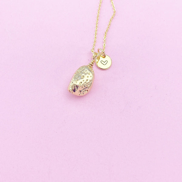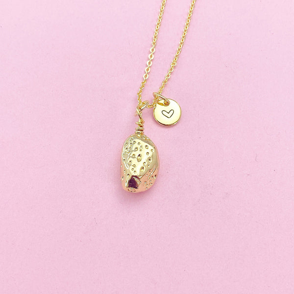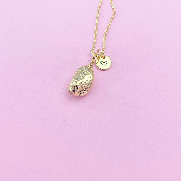 This is a gold -tone potato charm with hand stamped initial charm on brass/stainless steel 18 inches chain.