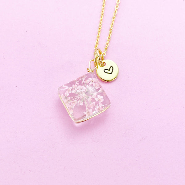 This is gold tone Press Flower charm with hand stamped initial charm on brass or stainless-steel chain.