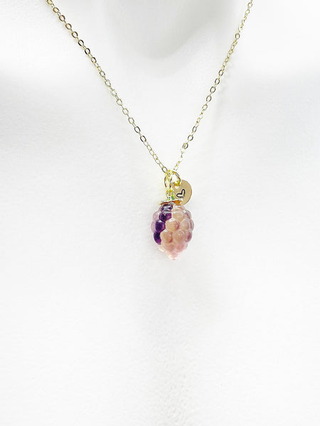 Gold Raspberry Necklace, Natural Gemstone Fluorite Fruit Charm, Personized Initial Necklace,
