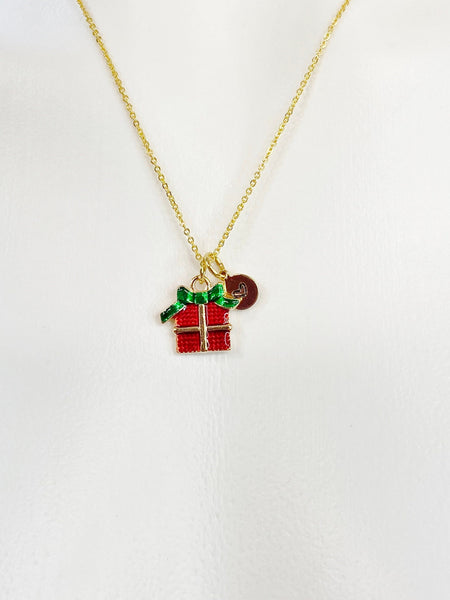This is a gold tone present box charm with hand stamped initial charm on gold plate brass/stainless steel 18 inches chain.