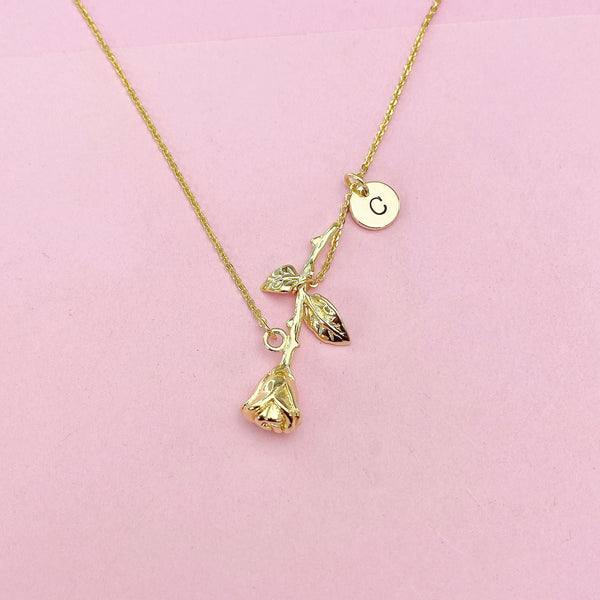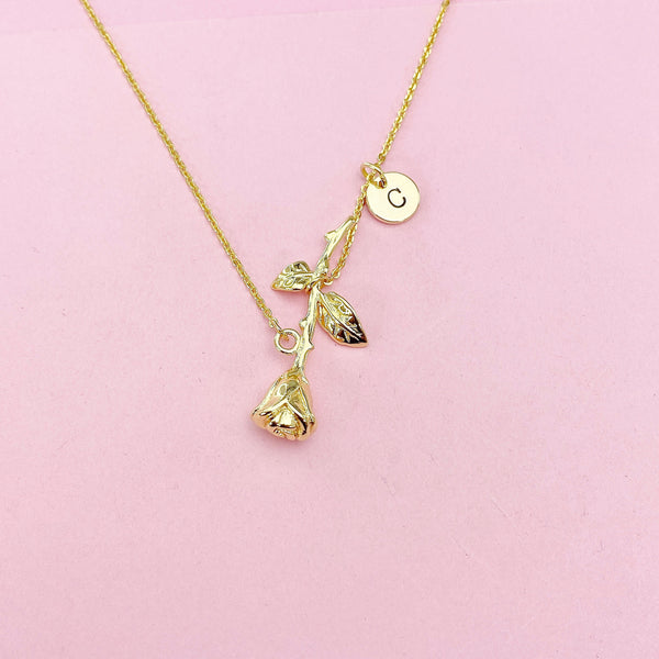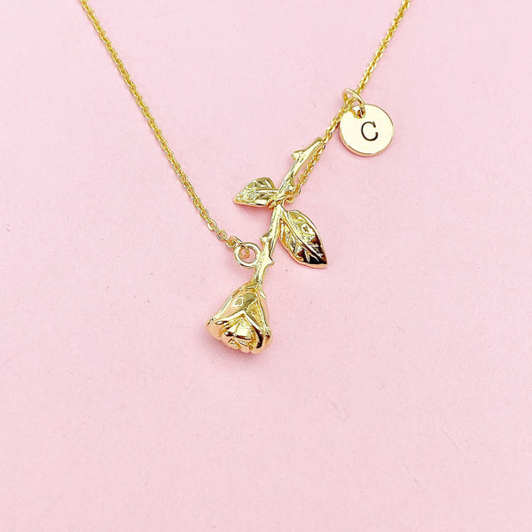 This is gold tone rose flower charm with hand stamped initial charm on brass or stainless-steel chain.