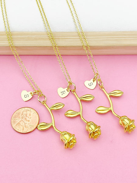 This is gold tone rose flower charm with hand stamped initial charm on brass/stainless steel 18 inches chain.