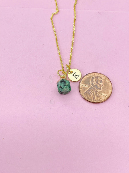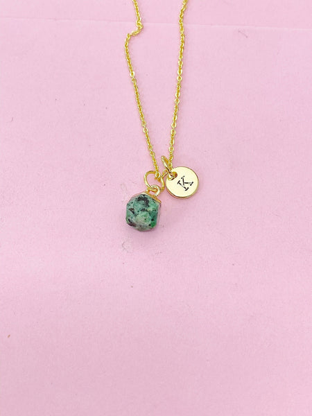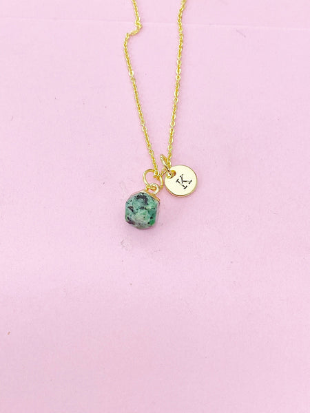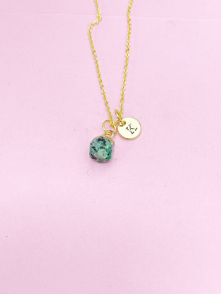 This is gold tone Ruby in Zoisite charm with hand stamped initial charm on brass or stainless-steel chain.