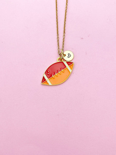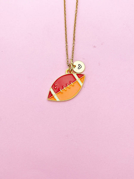 This is gold tone rugby charm with hand stamped initial charm on brass or stainless-steel chain.