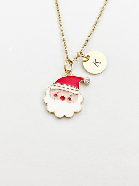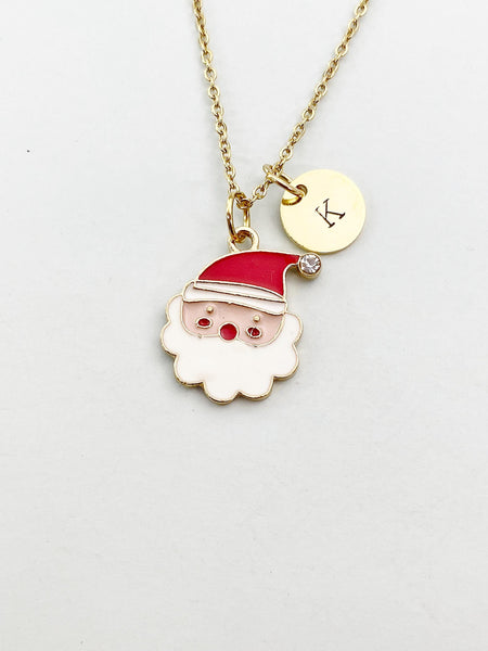This is a gold -tone Santa charm with hand stamped initial charm on brass or stainless steel 18 inches chain.