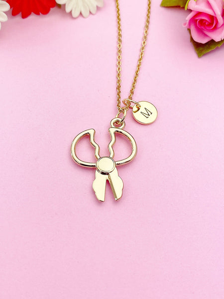 This is a gold-tone scissor charm with hand stamped initial charm on brass or stainless-steel chain.