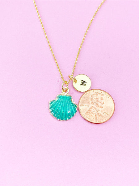 This is a gold tone Seashell charm with hand stamped initial charm on brass or stainless-steel chain.