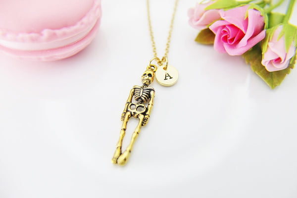 This is a gold or silver-tone skeleton charm with hand stamped initial charm on a stainless-steel chain.