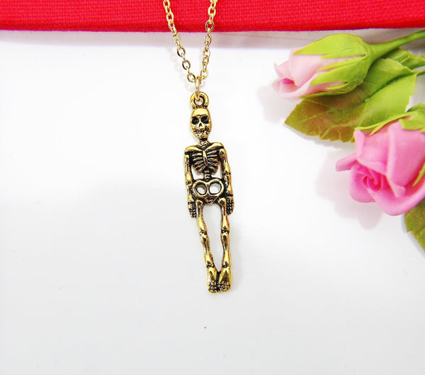 Halloween Necklace Gift, Gold Skeleton Necklace, Human Skeleton Charm Necklace, Halloween Decoration Jewelry Gift,