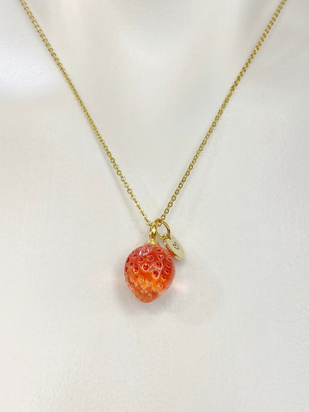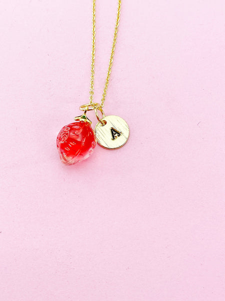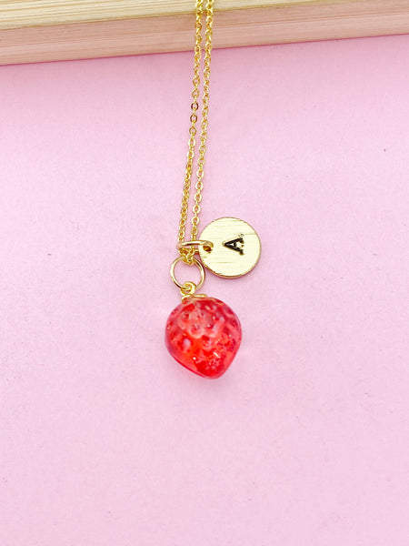 Gold Strawberry Necklace, Handmade Lampwork Strawberry Charm, Personized Initial Necklace,