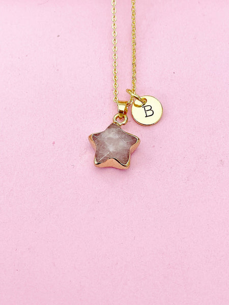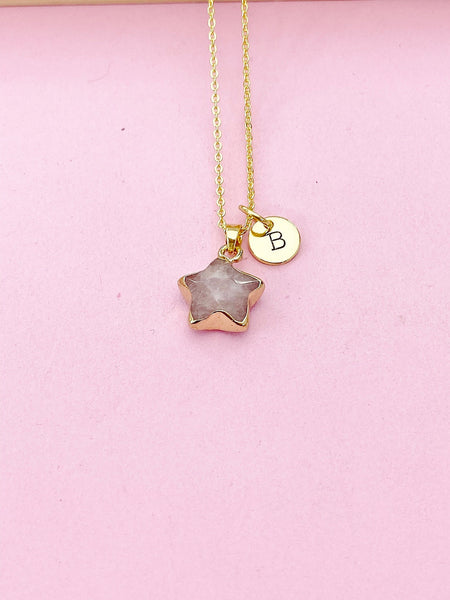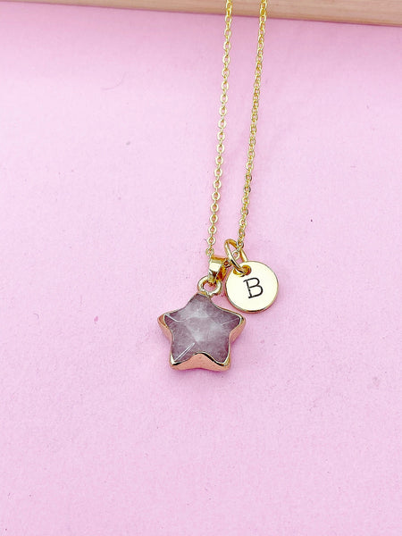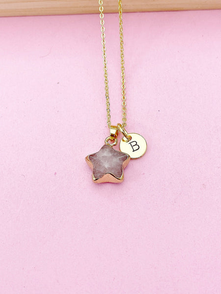 This is gold tone Natural Strawberry Quartz star charm with hand stamped initial charm on brass or stainless-steel chain.