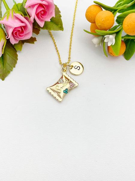 This is a gold -tone Sweet Candy charm with hand stamped initial charm on brass/stainless steel 18 inches chain.