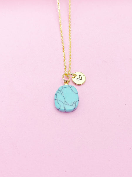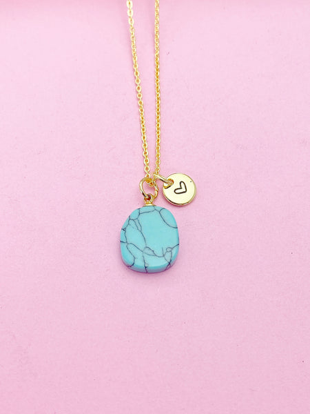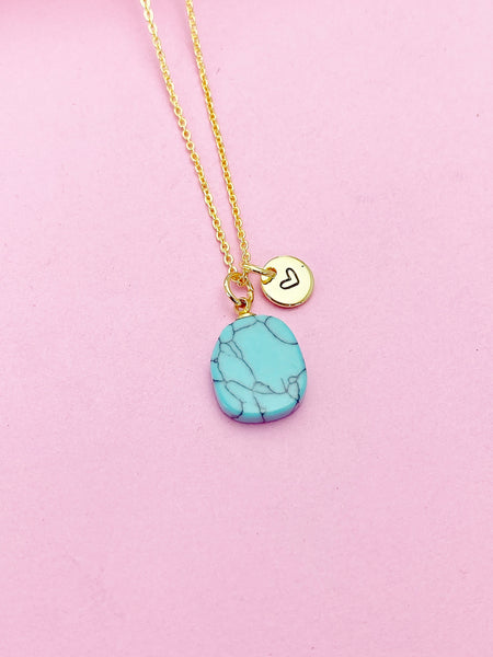 This is gold tone Synthetic Turquoise charm with hand stamped initial charm on brass or stainless steel chain.
