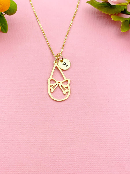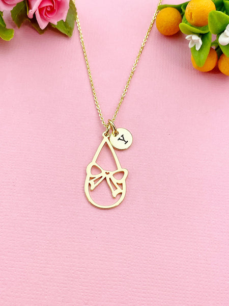 This is a gold tone teardrop with bowknot charm on brass or stainless-steel chain.