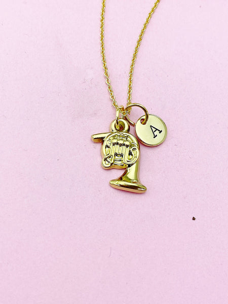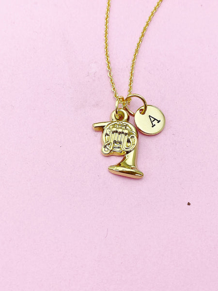 This is a gold -tone trumpet charm with hand stamped initial charm on brass/stainless steel 18 inches chain.