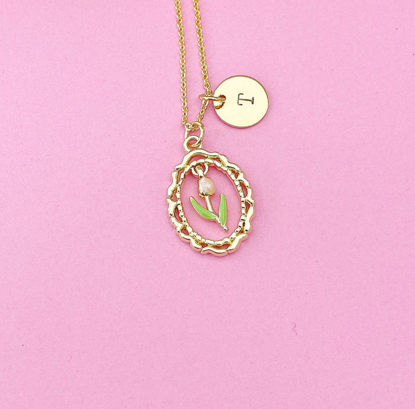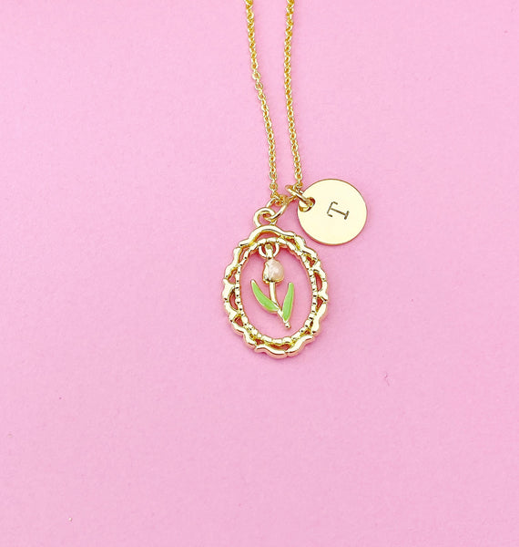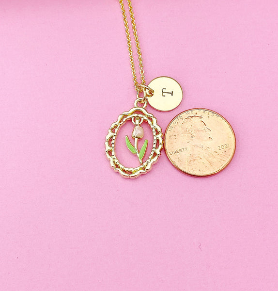 This is gold tone tulip charm with hand stamped initial charm on brass or stainless-steel chain.