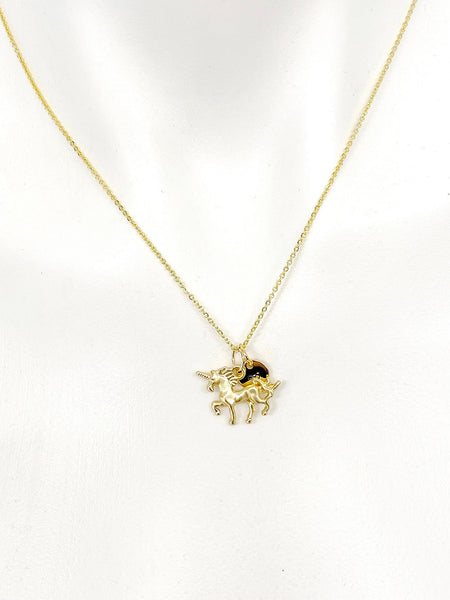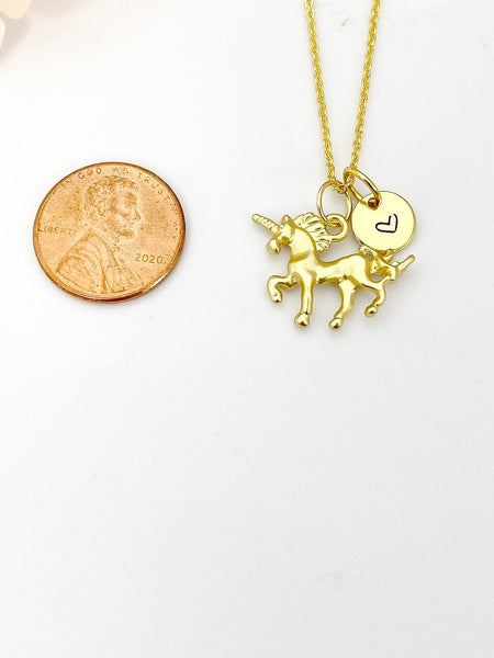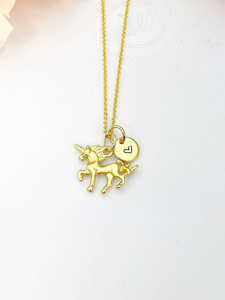 This is a gold -tone Unicorn charm with hand stamped initial charm on brass/stainless steel 18 inches chain.