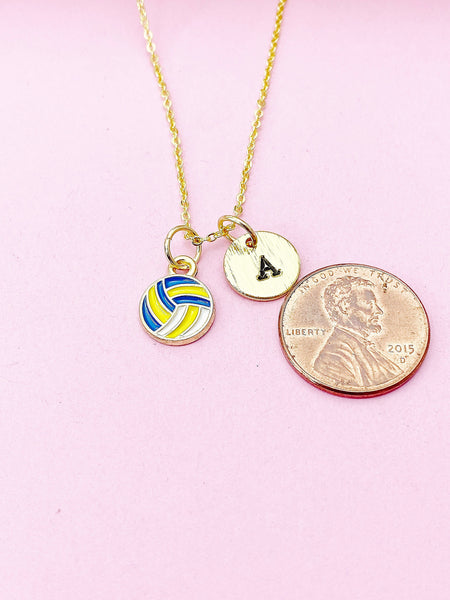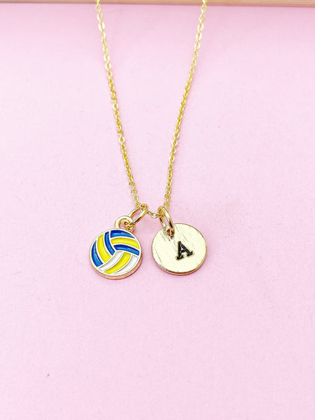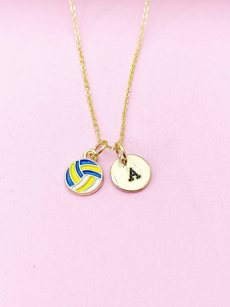 This is gold tone water polo volleyball charm with hand stamped initial charm on brass or stainless-steel chain.