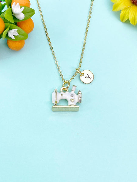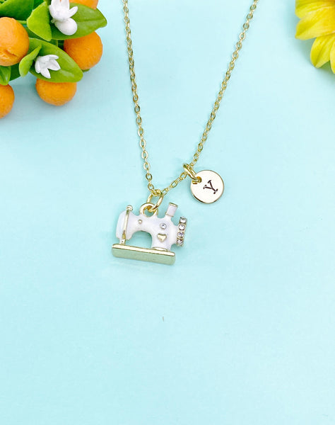 This is gold tone sewing machine charm with hand stamped initial charm on brass or stainless-steel chain.