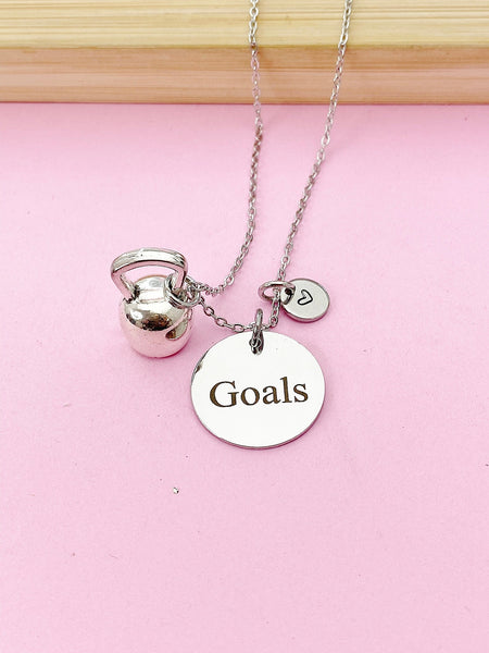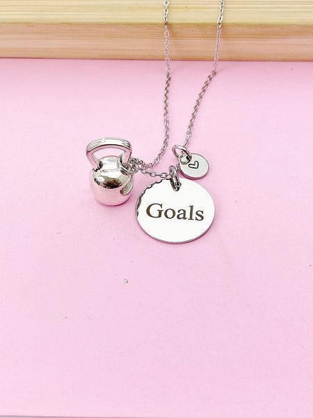 This is silver tone kettlebell and goals charm with hand stamped initial charm on stainless steel 18 inches chain.