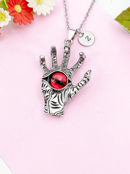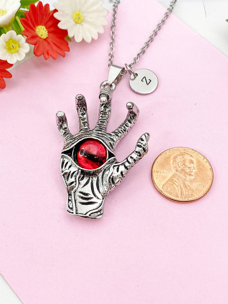 This is a silver tone hand with red eye charm with hand stamped initial charm on brass/stainless steel chain.