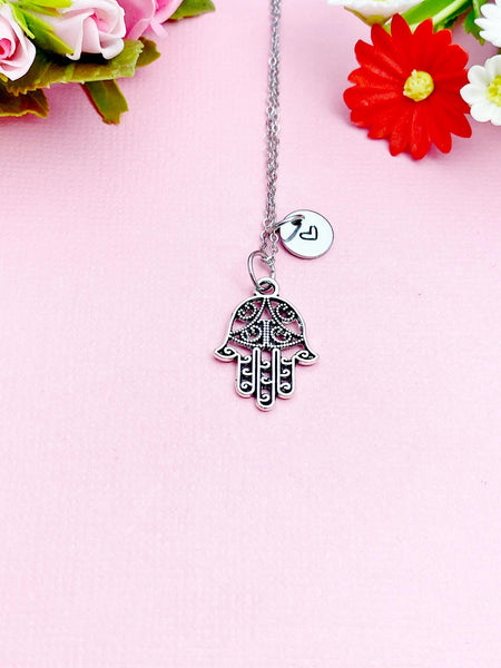 This is a silver-tone hamsa charm with hand stamped initial charm on brass or stainless steel 18 inches chain.