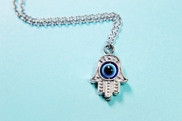 This is a silver -tone hand evil eye charm on brass or stainless steel chain.