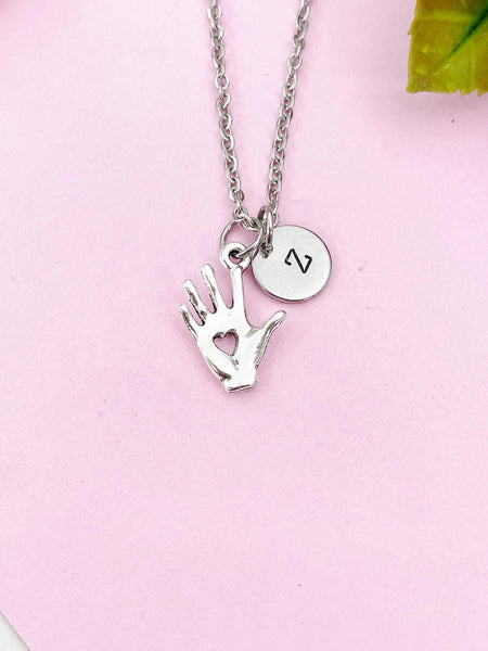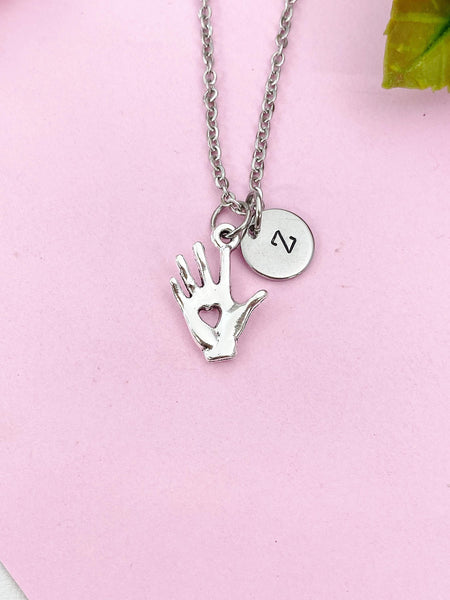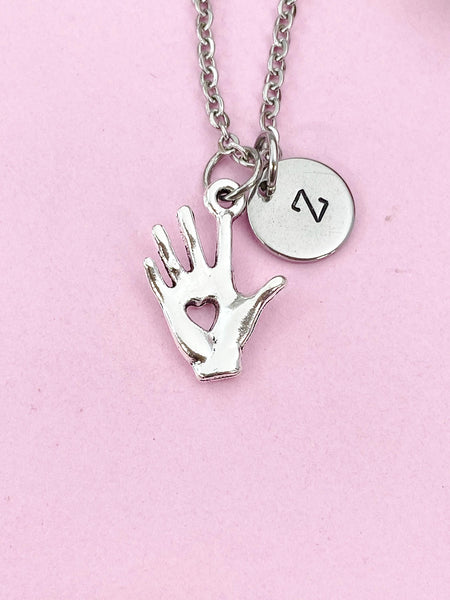 This is a silver tone Hand with Heart charm with hand stamped initial charm on brass/stainless steel chain.