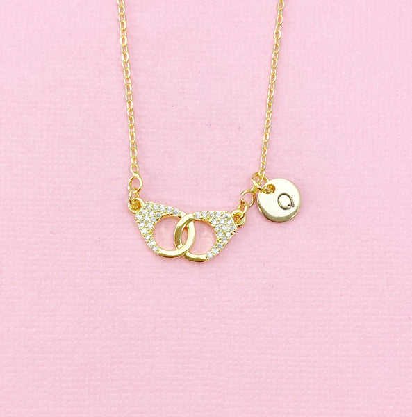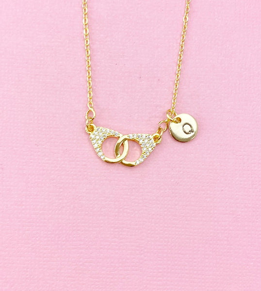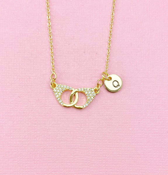 This is a gold -tone handcuff charm with hand stamped initial charm on brass/stainless steel 18 inches chain.