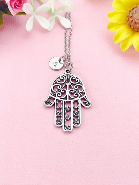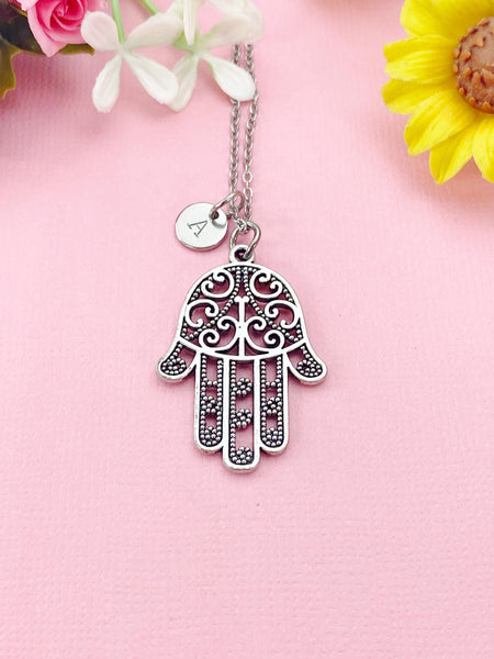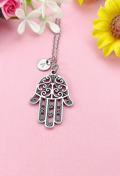 This is a silver -tone Hamsa hand charm with hand stamped initial charm on stainless steel or brass chain.