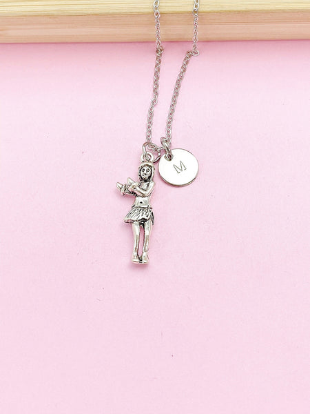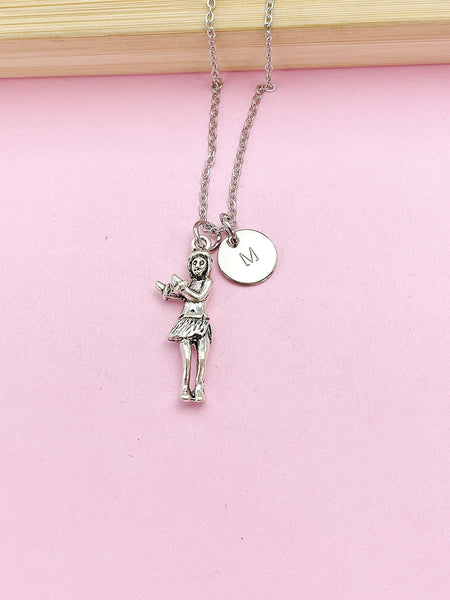 This is a gold or silver-tone Hawaii Hula Dance charm with hand stamped initial charm on stainless steel necklace.