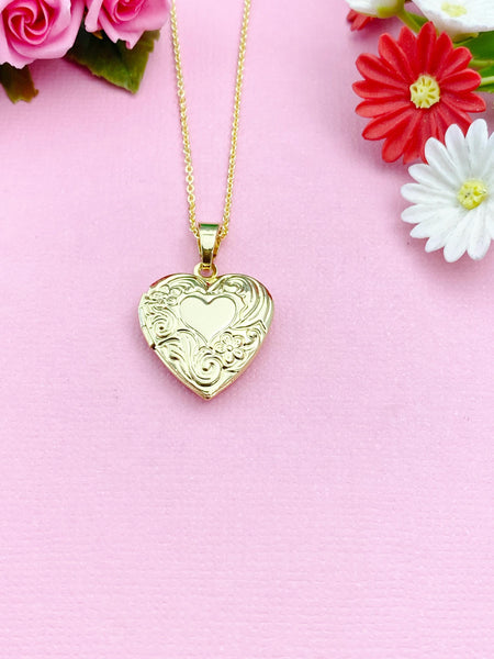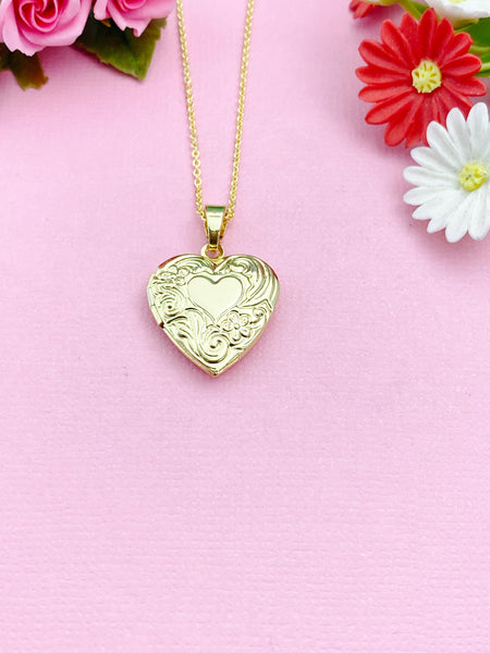 This is gold tone heart locket on brass or stainless-steel chain. *We do not provide the service of adding photos to locket.*
