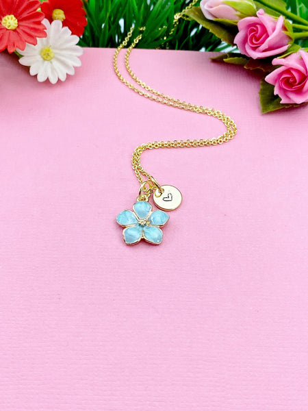 This is a gold-tone flower charm with hand-stamped initial charm on gold over stainless steel chain.
