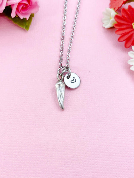 This is a silver-tone chili charm with hand stamped initial charm on brass or tarnish resistant stainless-steel chain.