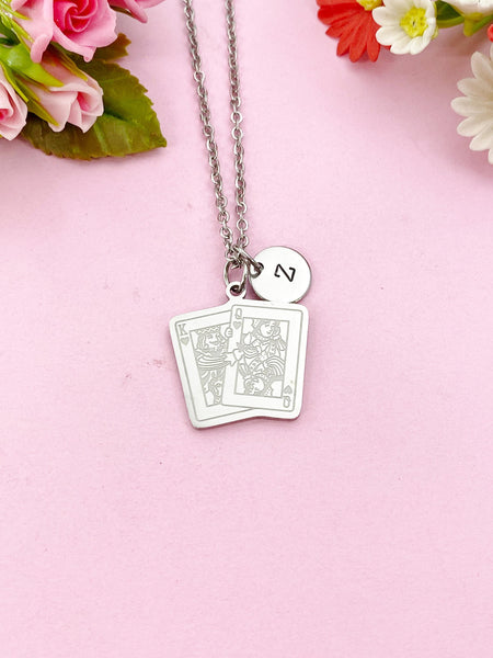 This is a silver or gold tone King Queen Poker Play Card charm with hand stamped initial charm on brass/stainless steel chain.