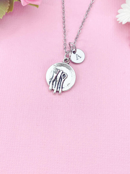This is a silver -tone Kitchen Utensil Tableware Plate charm with hand stamped initial charm stainless steel 18 inches chain or bracelet or keyring.