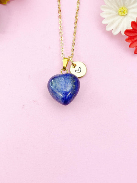 This is a gold tone Natural Lapis Lazuli charm with hand stamped initial charm on brass/stainless steel chain.