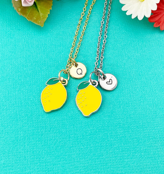 This is a gold or silver tone lemon charm with hand stamped initial charm on brass/stainless steel chain.