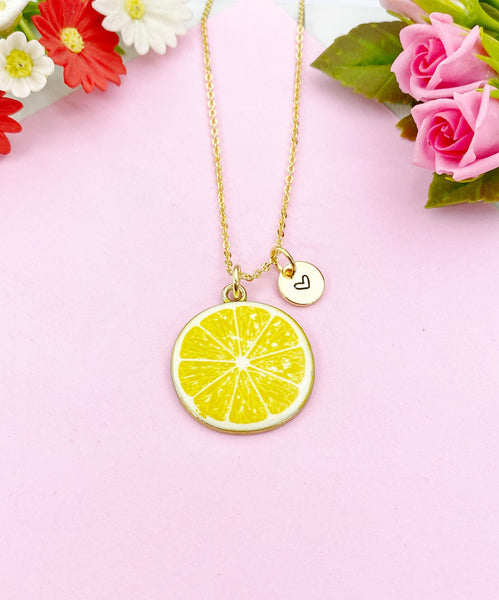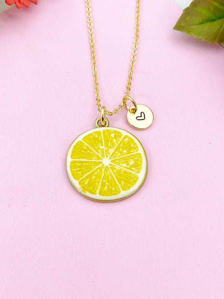 This is a gold tone Lemon Slice charm with hand stamped initial charm on brass/stainless steel chain.