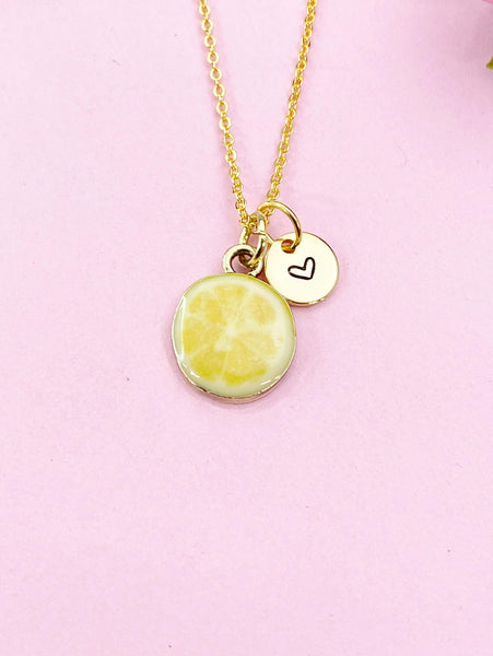 This is a gold tone Lemon Slice charm with hand stamped initial charm on brass/stainless steel chain.