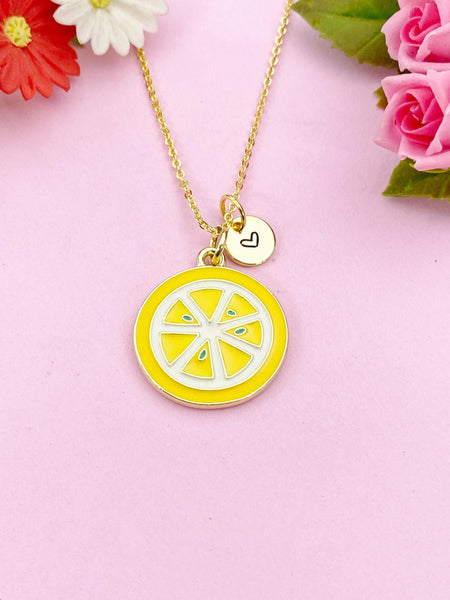 This is a gold tone Lemon Slice charm with hand stamped initial charm on brass/stainless steel chain.