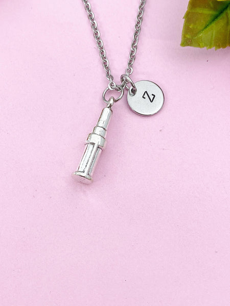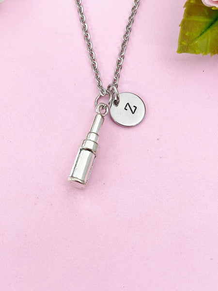 This is a silver tone Lipstick charm with hand stamped initial charm on brass/stainless steel chain.