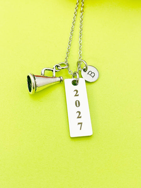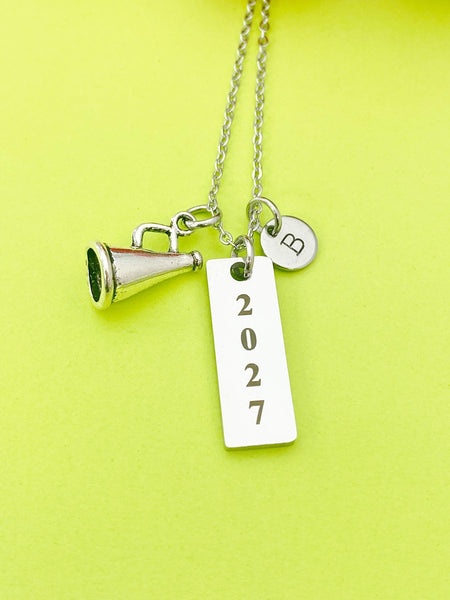 This is a unique engraving year on stainless steel tag and megaphone charm with hand stamp initial charm on stainless steel 18 inches necklace chain