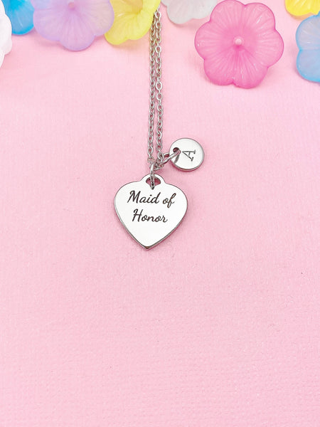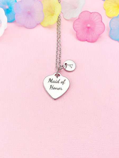 This is an engraving maid of honor on stainless steel with hand stamp Initial charm on stainless-steel chain.