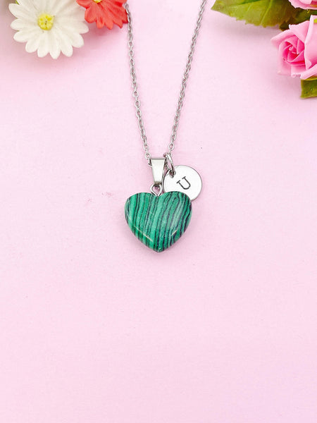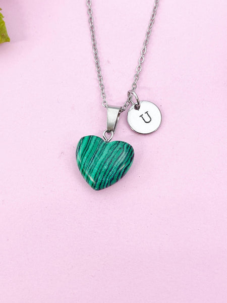 Malachite Heart Charm Silver Necklace, Synthetic Malachite Gemstone Jewelry, N6270