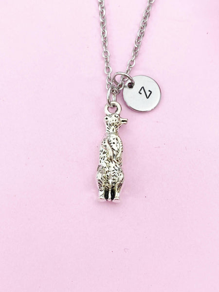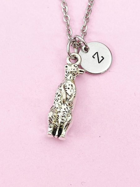 This is a silver tone Meerkat charm with hand stamped initial charm on brass/stainless steel chain.