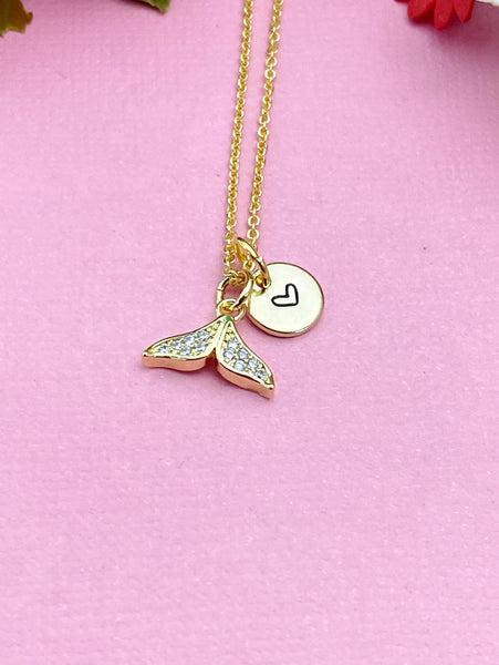 This is a gold-tone mermaid tail with hand stamped initial charm on brass/stainless steel 18 inches chain.